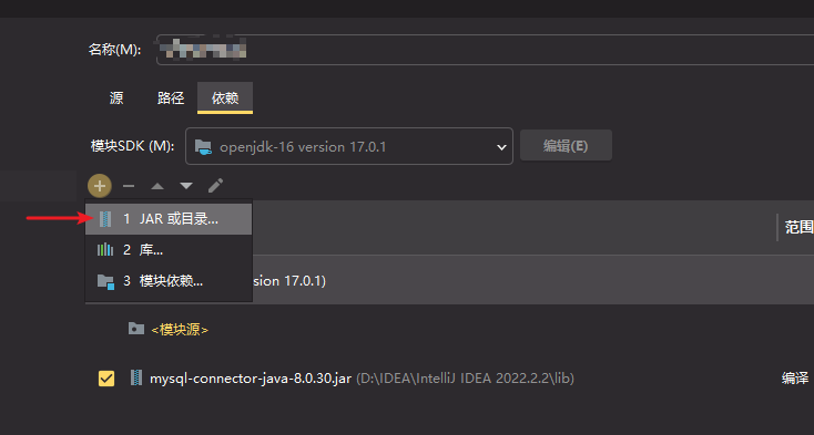 - 找到模块 (theModule), 选择想要连接数据库的项目,然后点击依赖 (relyOn), 最后点击加号.