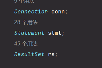 - 首先,实例化这三个对象。根据我的理解,第一个 (Connection) 就是用来连接数据库的,第二个 (Statement) 是连接数据库之后,想要运行 mysql 语句用的,最后一个 (Resultset) 就是用来得到或更新你的 mysql 语句的结果.(可以先不用写这一步,你用到再写应该也行)
