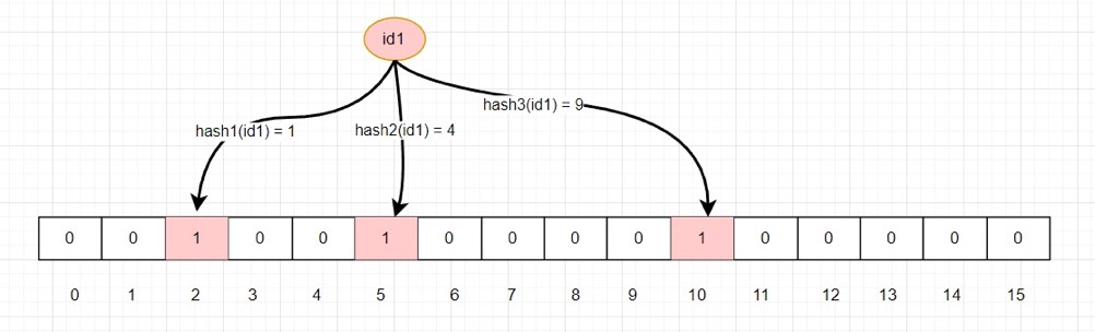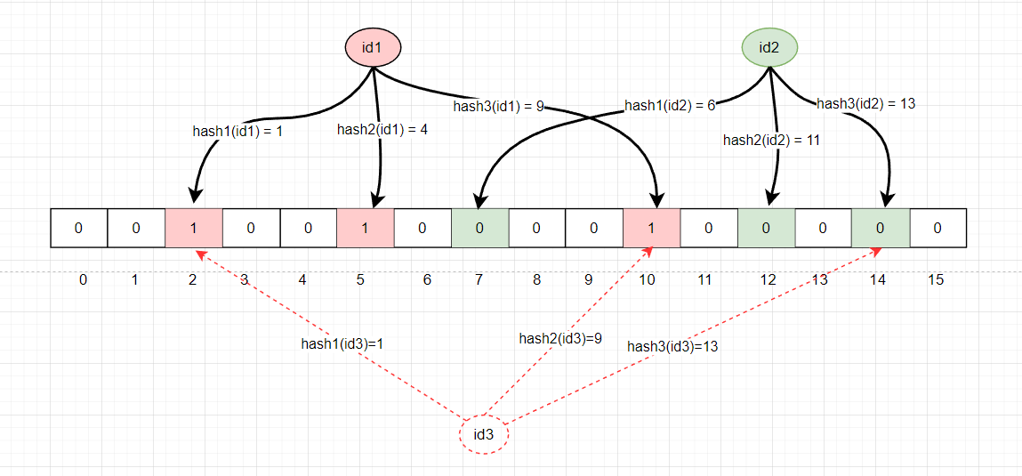 假设当前的布隆过滤器中提供了三个hash函数,此时就使用三个hash函数对id1进行哈希运算,运算结果分别为:2、5、10那么就会数组中对应的位置数据更改为1。