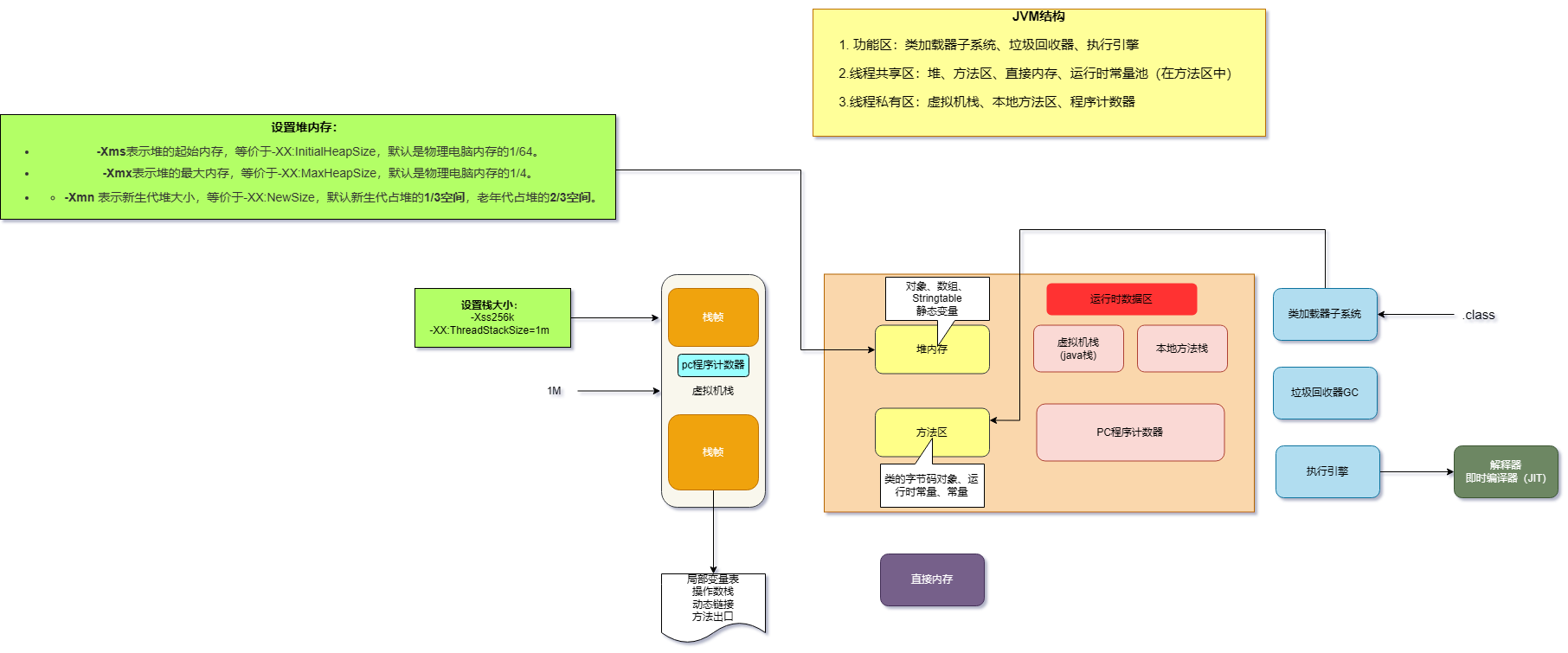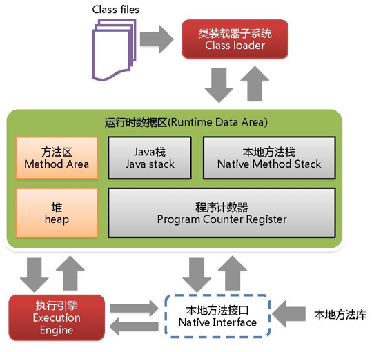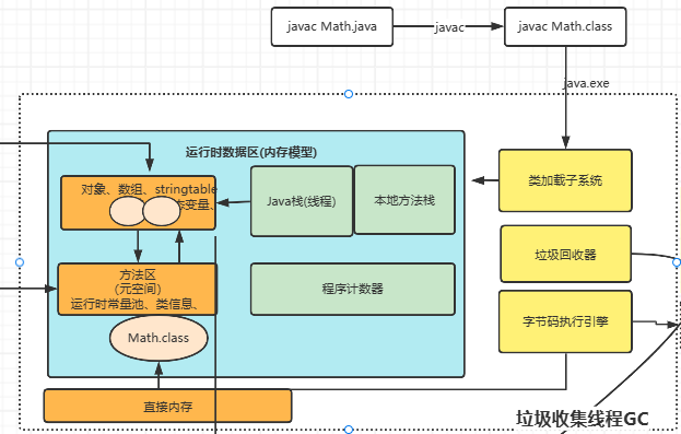 - 功能区: 类加载器子系统、垃圾回收器、字节码执行引擎