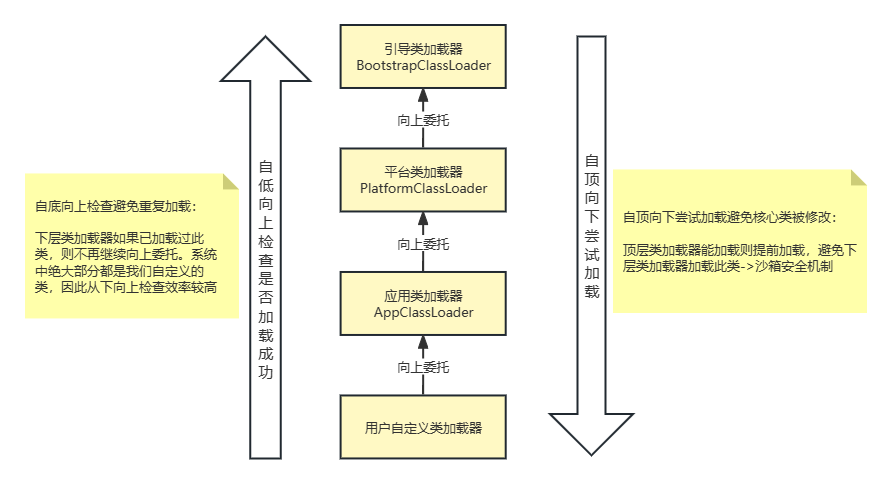 - 1、当AppClassLoader加载一个class时,它首先不会自己去尝试加载这个类,而是把类加载请求委派给父类加载器PlatformClassLoader去完成。