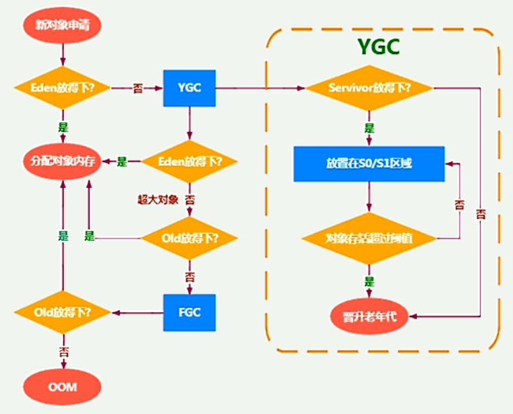 - 当堆内存空间不足以分配新对象时,会触发一次Full GC。这种情况下,Java虚拟机会先执行一次新生代的垃圾回收(Minor GC),如果仍然无法满足内存需求,则会执行Full GC。