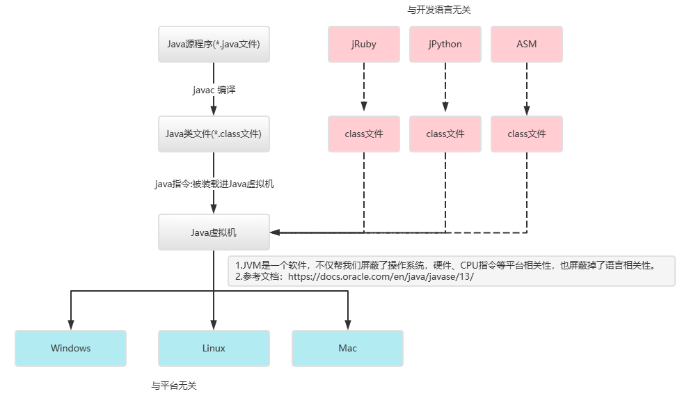 **JVM的作用:**加载并执行Java字节码文件(.class) - 加载字节码文件、分配内存(运行时数据区)、运行程序