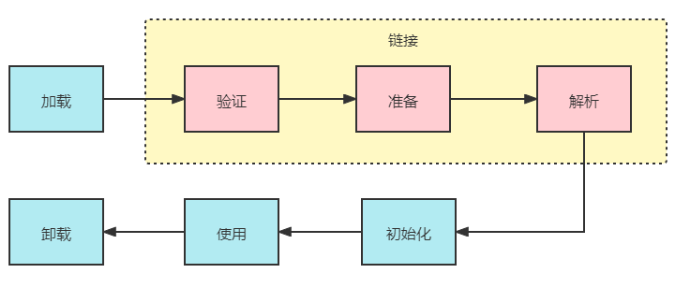 类加载过程主要分为三个步骤:加载、链接、初始化,而其中链接过程又分为三个步骤:验证、准备、解析,加上卸载、使用两个步骤统称为为类的生命周期。