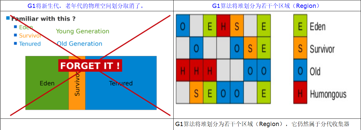 G1之前分为年轻代和老年代,且是连续的空间。G1之后也存在年轻代、老年代,多了一个HUmongous:用来存储内存超过region一半的大对象,如果不够则两个H合并,但是他们被分为2048个空间(region)。